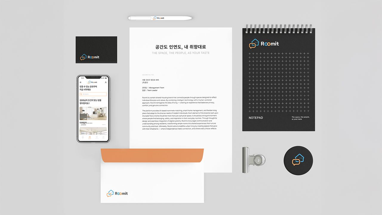 Room + it의 합성어로, 현대의 주택 문제 해결을 위한 공유 주거서비스를 제공한다. 공유주택을 표현하기 위한 집과 소통의 의미인 말풍선을 함께 배치하여 공간을 잇는 의미를 담았다. 브랜드명인 룸잇에는 방을 잇다는 의미를 담아 원을 겹쳐 이어지는 느낌의 형태 로고로 디자인하였다.