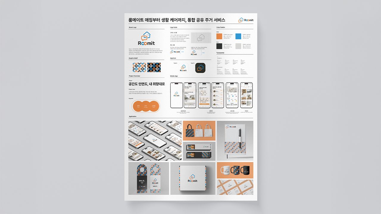 룸메이트 매칭부터 생활 케어까지, 통합 공유 주거 서비스Room + it의 합성어로, 현대의 주택 문제 해결을 위한 공유 주거서비스를 제공한다. 공유주택을 표현하기 위한 집과 소통의 의미인 말풍선을 함께 배치하여 공간을 잇는 의미를 담았다. 브랜드명인 룸잇에는 방을 잇다는 의미를 담아 원을 겹쳐 이어지는 느낌의 형태 로고로 디자인하였다.