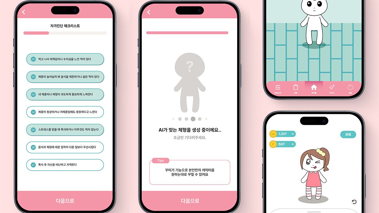 청소년의 건강한 식습관 형성과 섭식장애 완화를 돕는 AI 기반 앱 서비스AI가 사용자 체형에 맞는 맞춤형 캐릭터를 생성해, 캐릭터를 키우고 꾸미는 과정을 통해 사용자가 자신의 마음 상태를 자연스럽게 인식할 수 있다. 게임적 요소를 활용해 식사와 체형에 대한 부담을 완화하고 정서적 안정을 돕는다.
