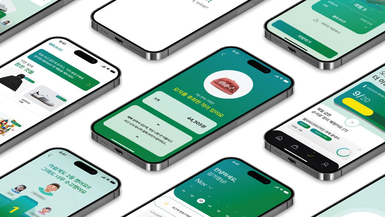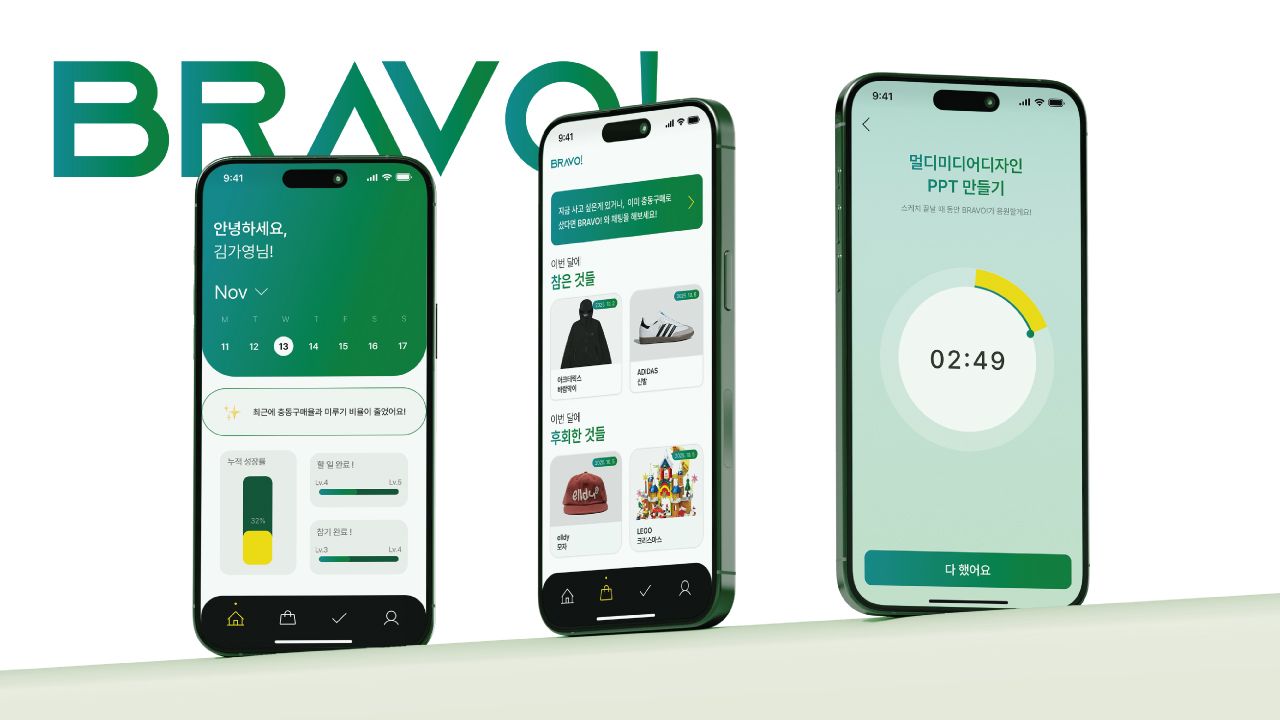 Bravo!는 미루기와 충동구매로 인해 낮아지는 자존감을 회복하도록 돕는 자기관리 모바일 서비스이다. 사용자는 목표를 설정하고 실천 과정을 기록하여 행동의 변화를 시각적으로 매일 확인할 수 있다. 본 서비스에서 제공하는 실천과 행동 변화의 경험을 통해 스스로 통제력을 회복할 수 있다. 이를 통해 사용자의 작은 실천이 자존감의 향상으로 이어지는 긍정적 순환체계를 경험하도록 설계하였다.