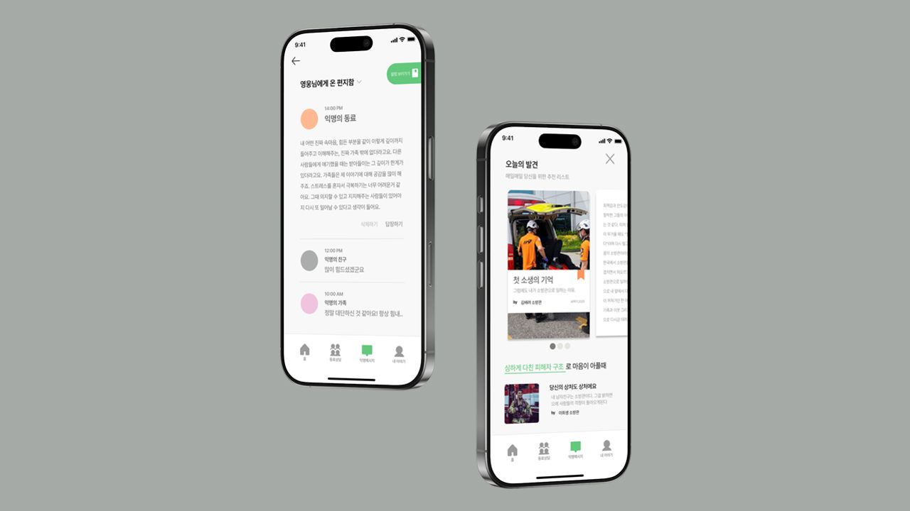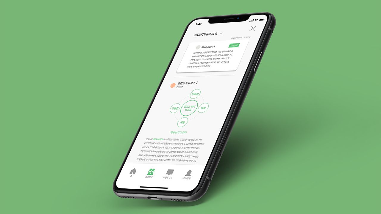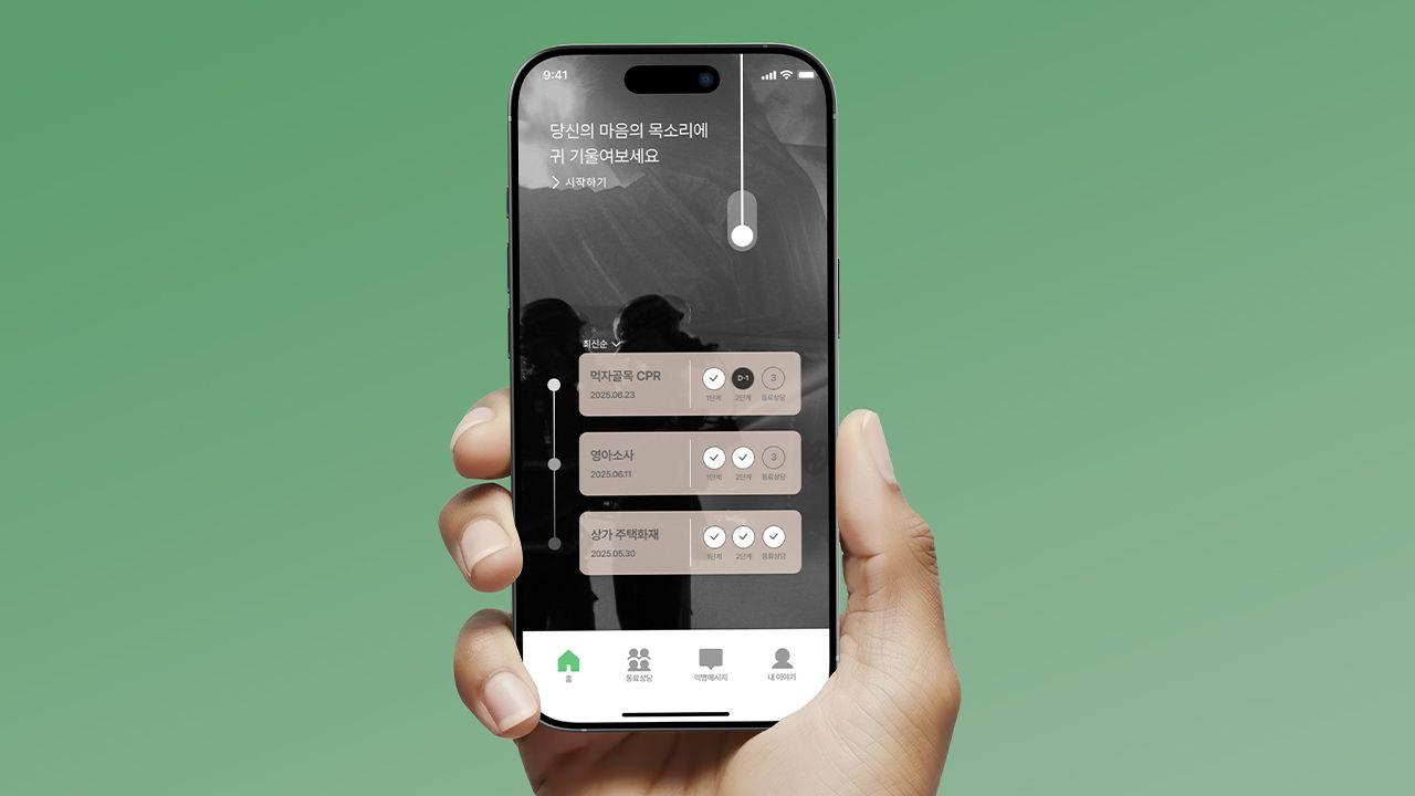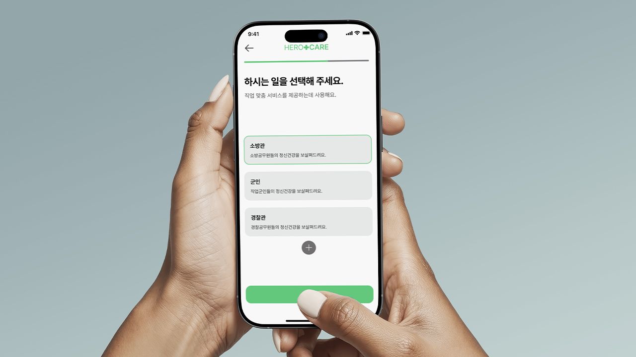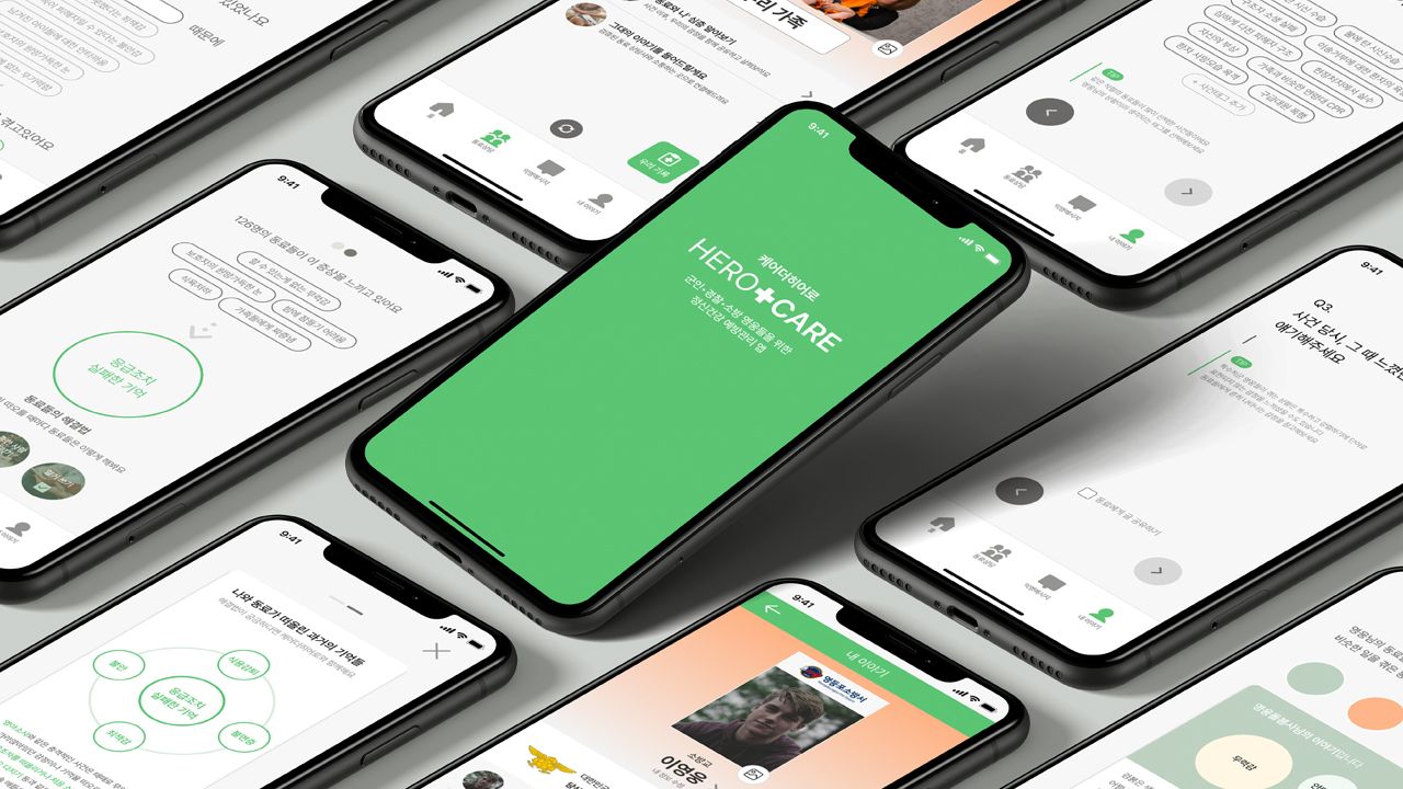 특수직군 PTSD 정신건강 케어 앱케어더히어로는 PTSD로 힘들고 지친 특수직 영웅들을 위한 앱으로, 군인•경찰•소방을 비롯해 다양한 특수직군에 종사하는 사람들의 정신건강을 예방 관리하고