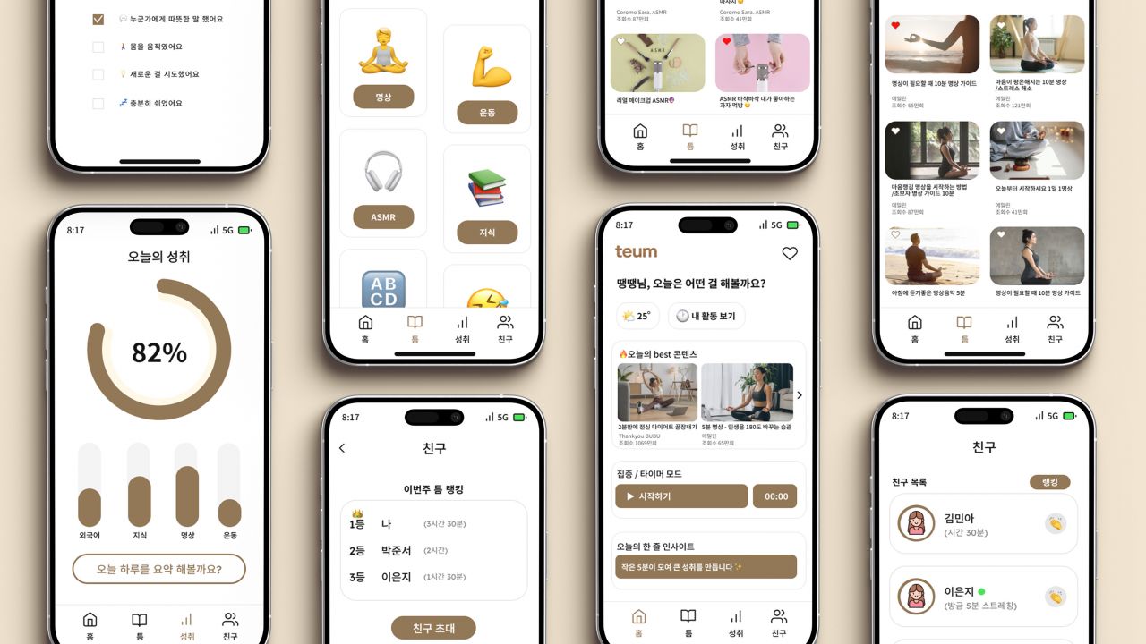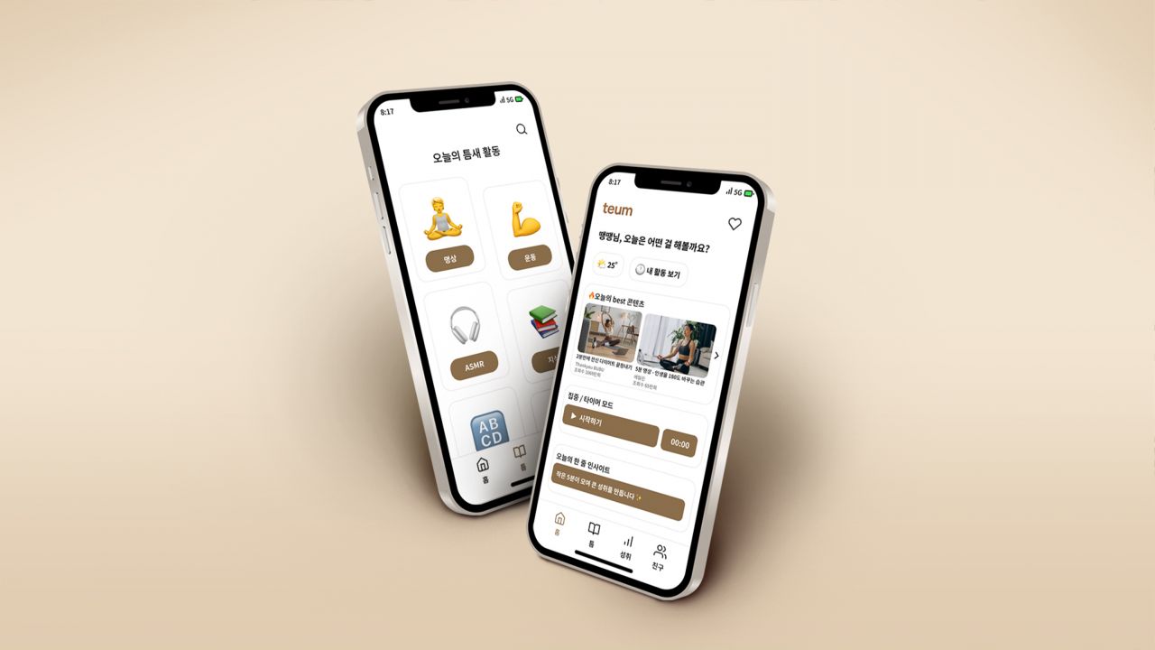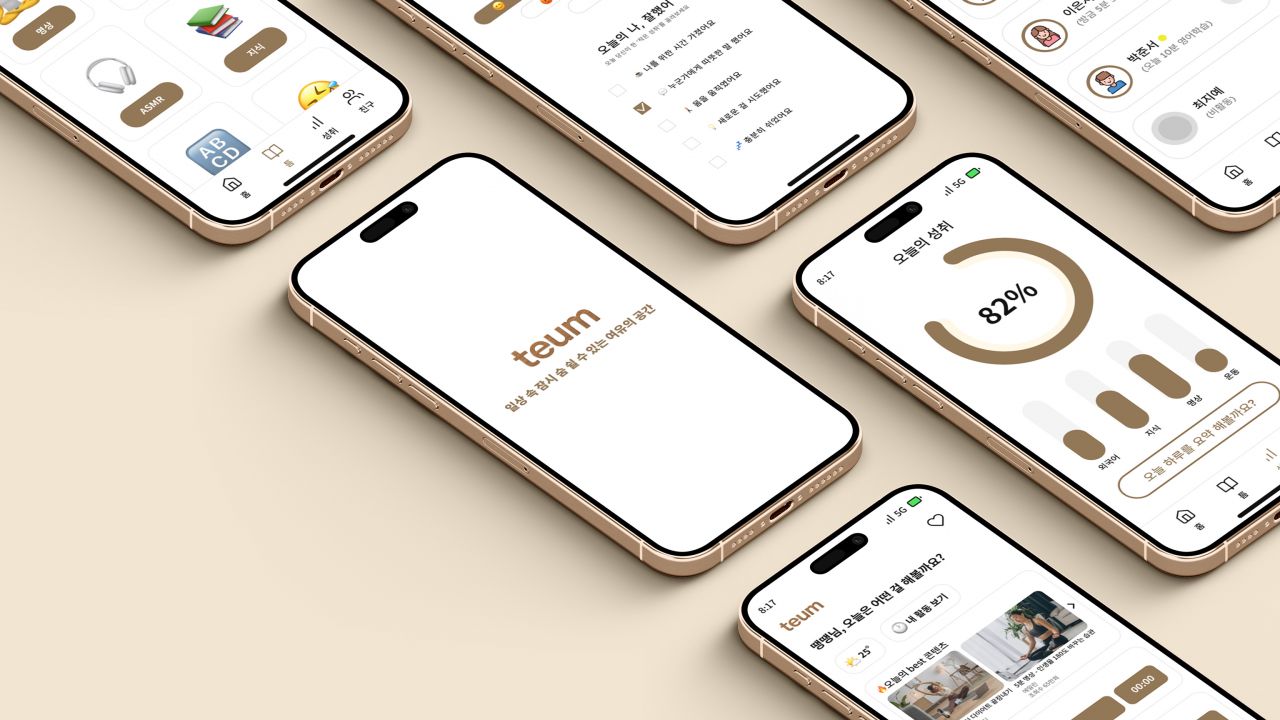 바쁜 일상 속 잠시 멈춰 숨을 고를 수 있는 여가 관리 앱이다. 사용자의 감정 상태와 여가 성향을 바탕으로,짧은 시간 안에서도 마음을 채울 수 있는 마이크로 여가를 제안한다. 기록, 명상, 음악 감상 같은 잔잔한 루틴을 통해 사용자는 하루 속 작은 틈을 발견하고, 자신을 돌보는 습관을 만들어간다.