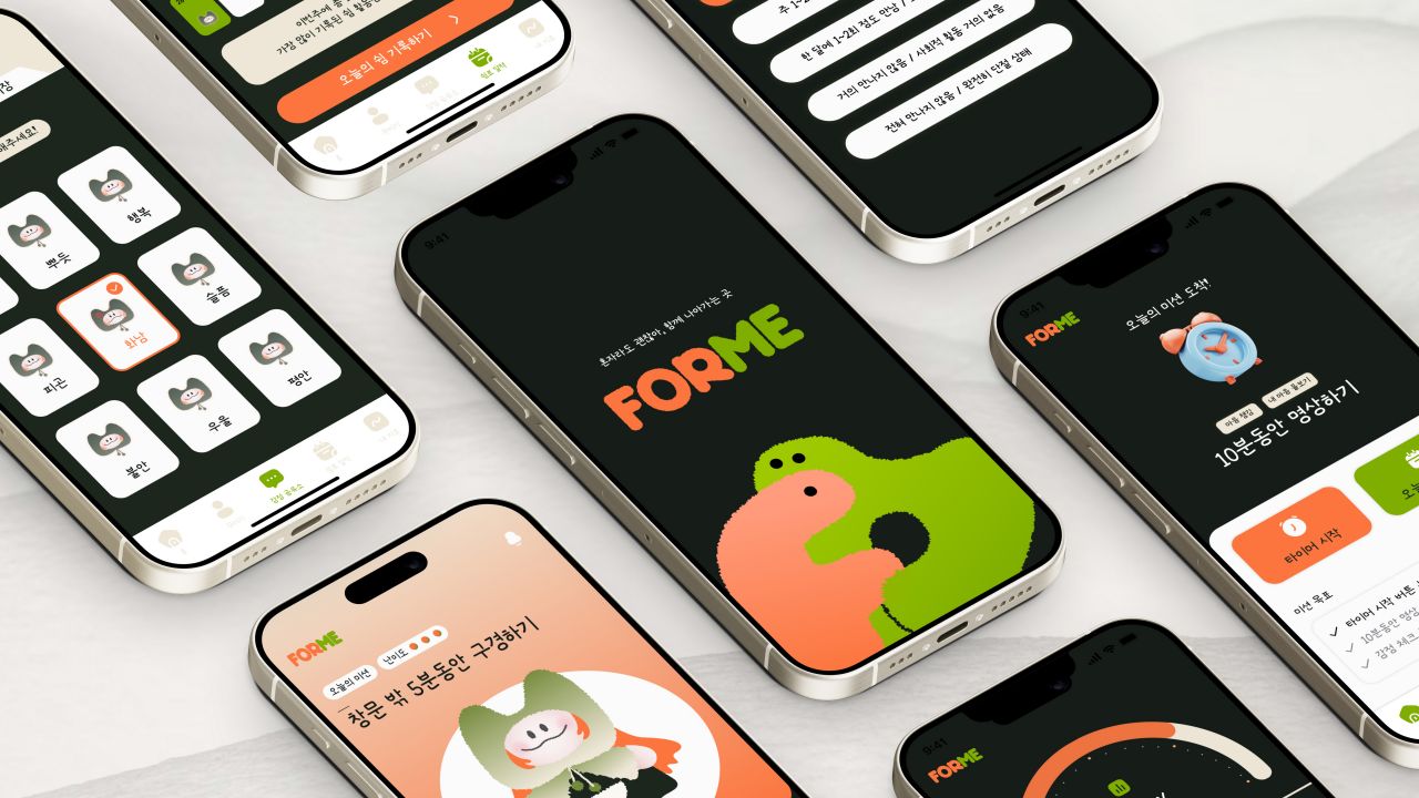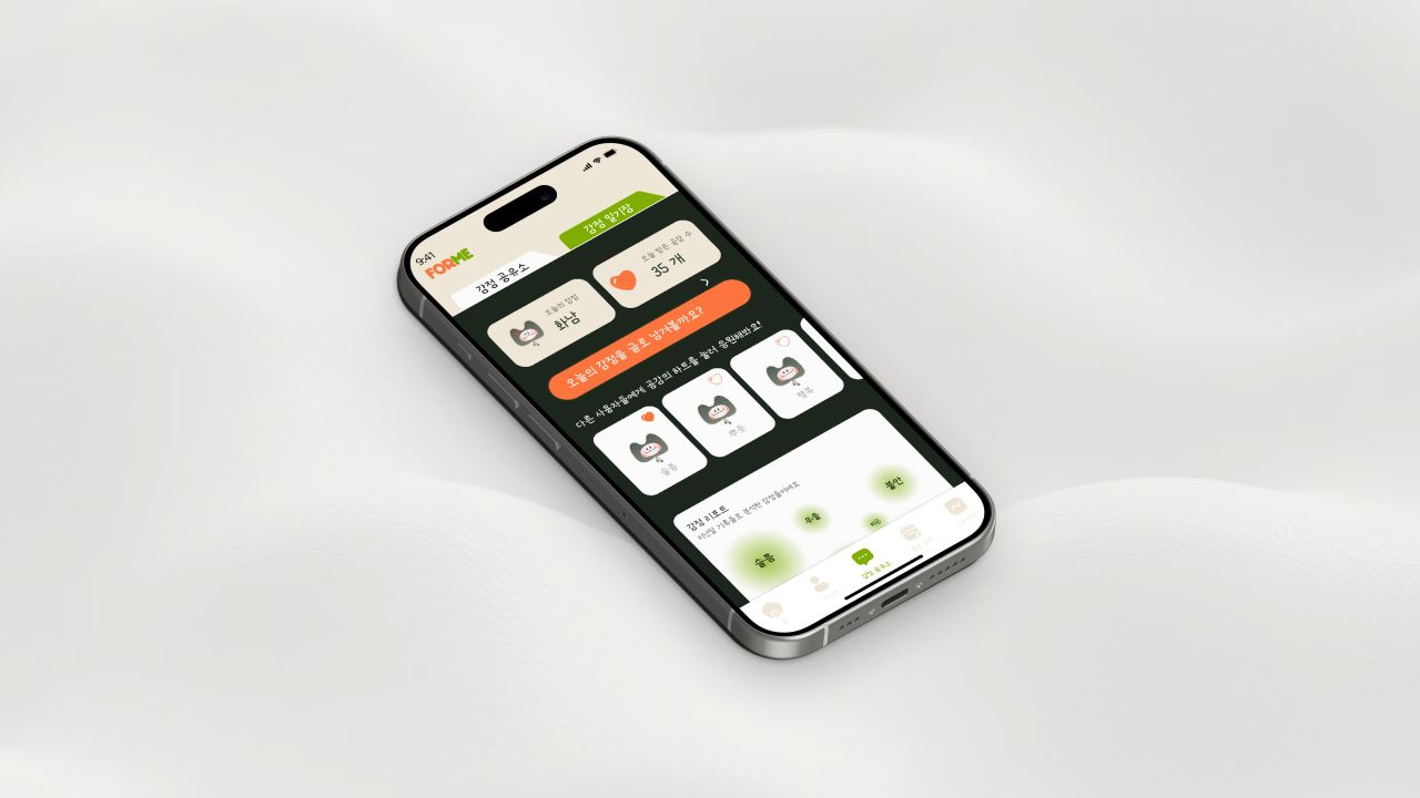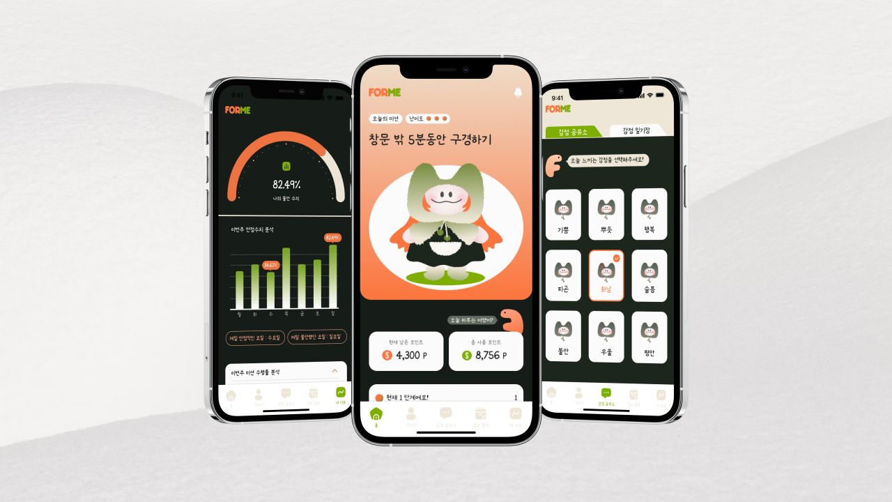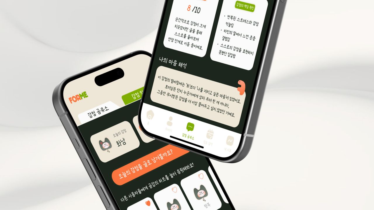 FOR ME는 AI 감정 분석과 성장형 캐릭터를 통해 사용자가 자신을 이해하고 회복하도록 돕는 멘탈 케어 앱이다. 심리적 압박을 최소화한 UI와 점진적 성장 루틴으로 자기돌봄을 일상화하며, 정서적 안정과 긍정적 에너지를 시각화했다. AI 코칭과 감정 리포트를 통해 사용자는 스스로의 감정을 객관화하고, 디지털 공간 속에서 다시 사회와 연결되는 경험을 하도록 하였다.