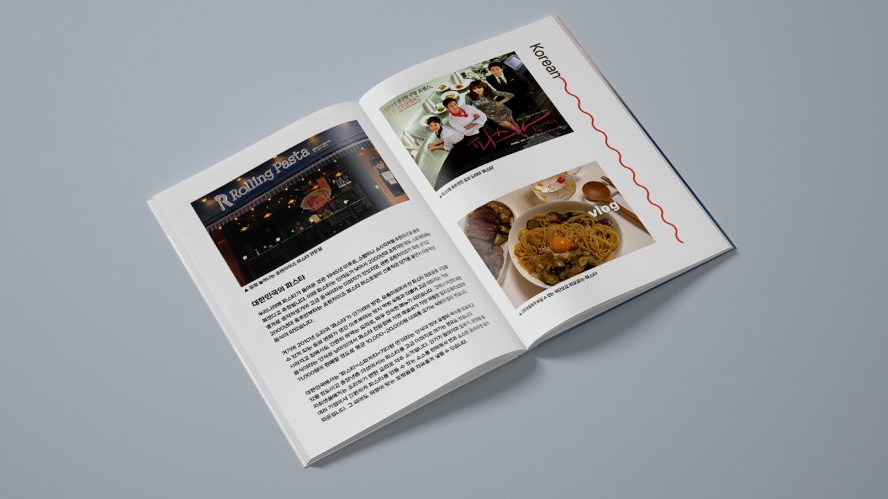 파스타에 관한 정보를 메인으로 책을 구성, 제목에 맞게 사진을 적극적으로 활용하였다.