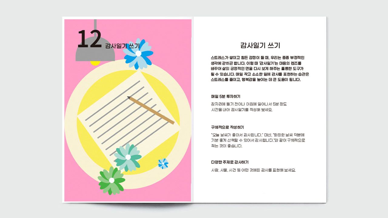 스트레스에 관한 정보와 16가지의 스트레스 해소법을 담은 책자이다. 일상 속에서 받는 스트레스를 잘 이해하며, 해소할 수 있게 제작하였다.