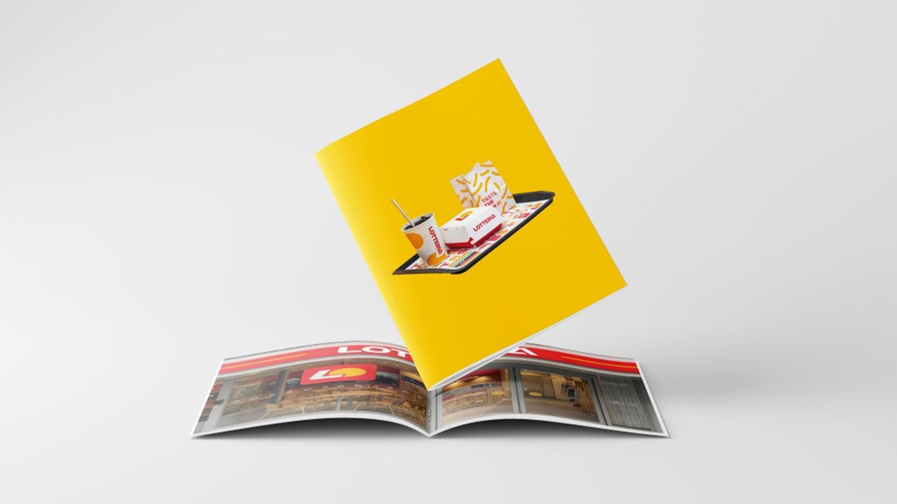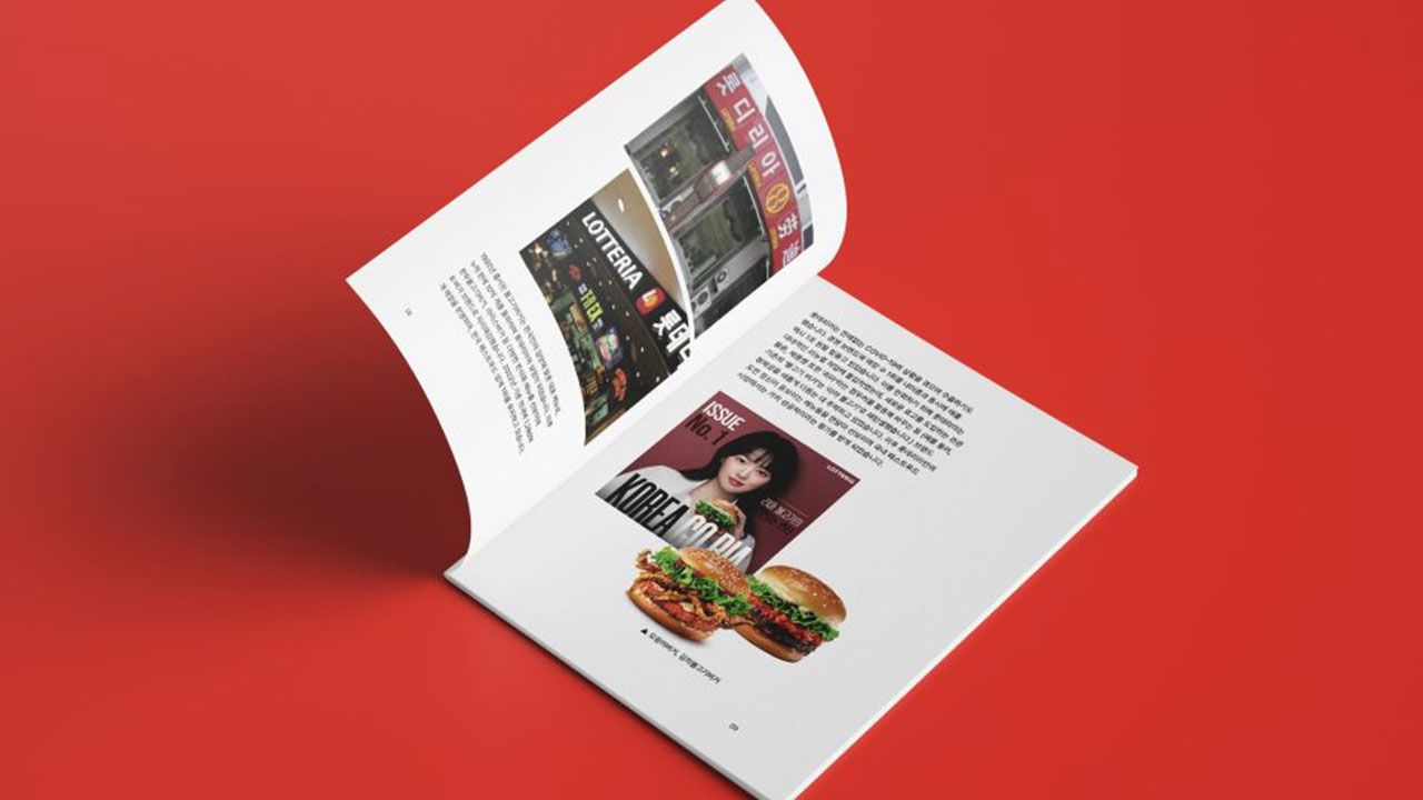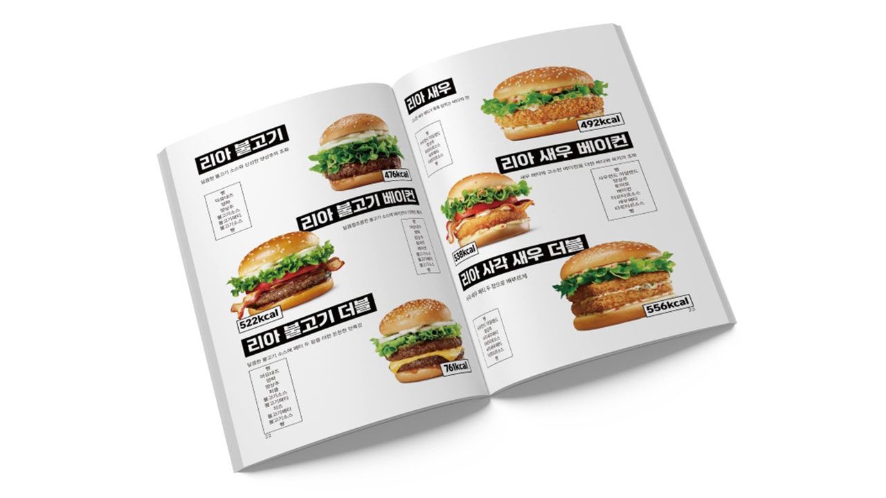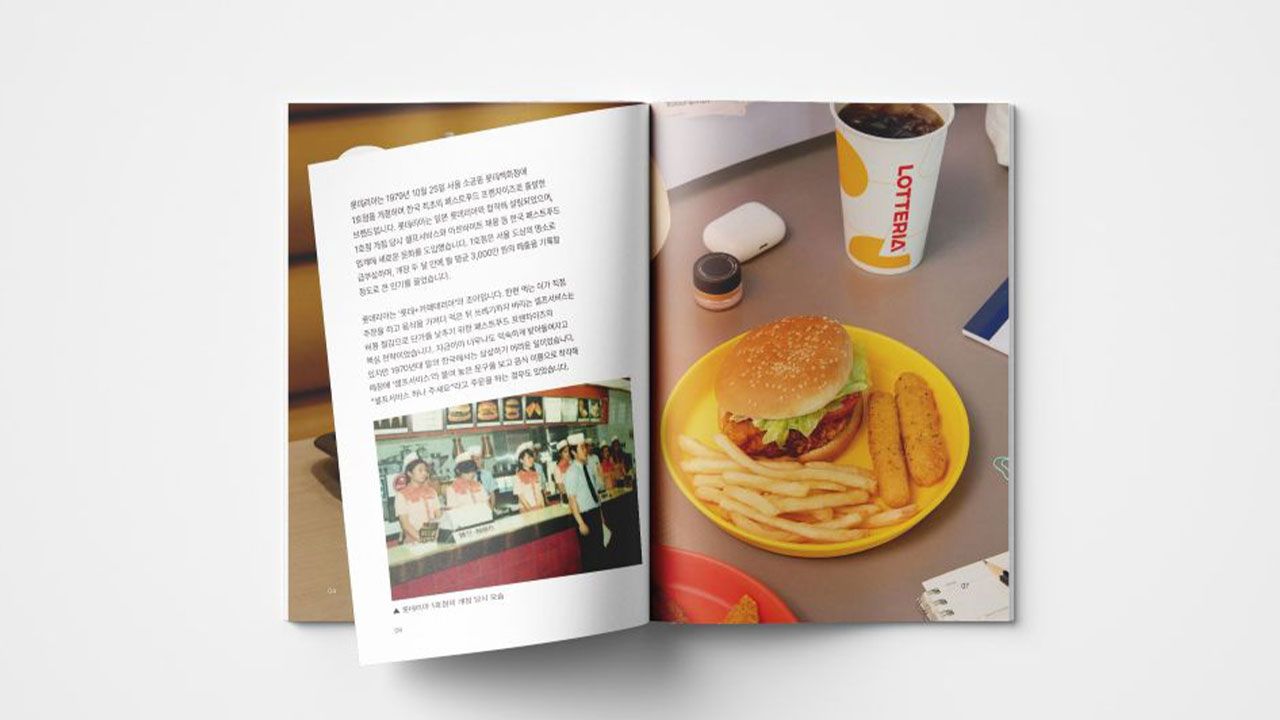 롯데리아의 브랜드 아이덴티티와 주요 메뉴의 특징을 한눈에 볼 수 있도록 구성한 소책자이다.