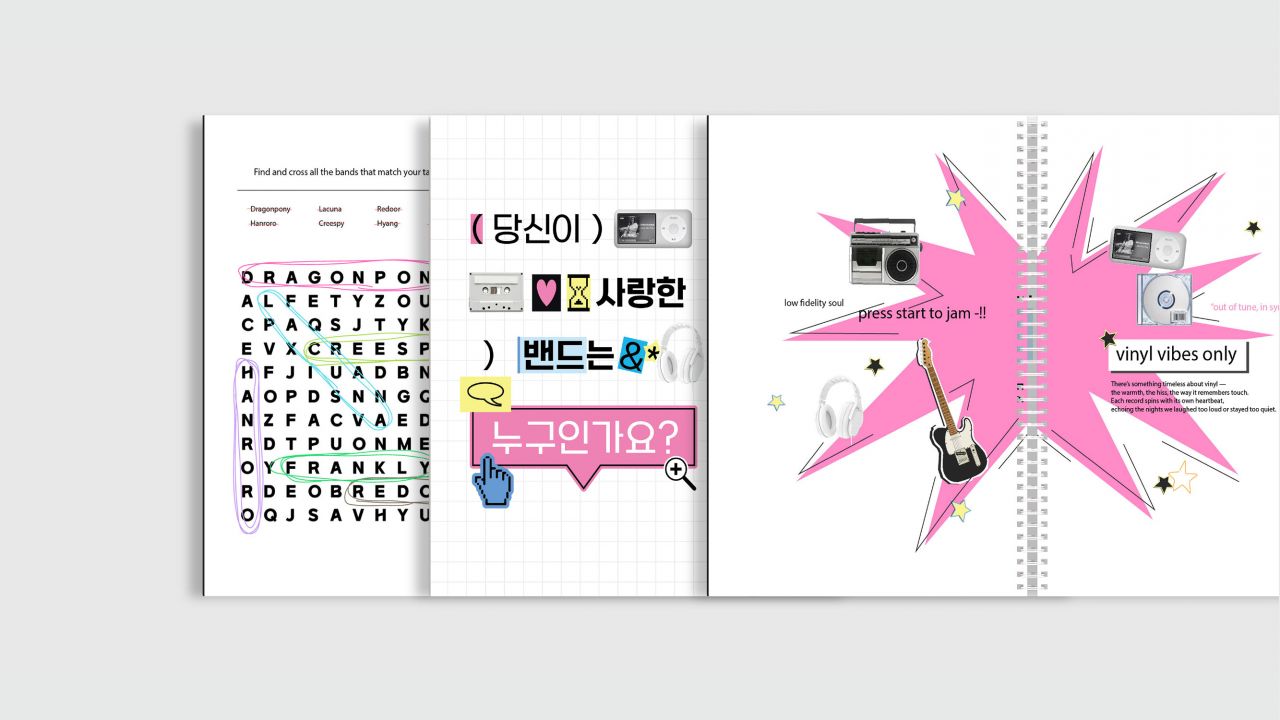좋아하는 밴드와 앨범들을 스크랩북 형식으로 기록하고, 나만의 음악 취향을 아카이빙하였다.