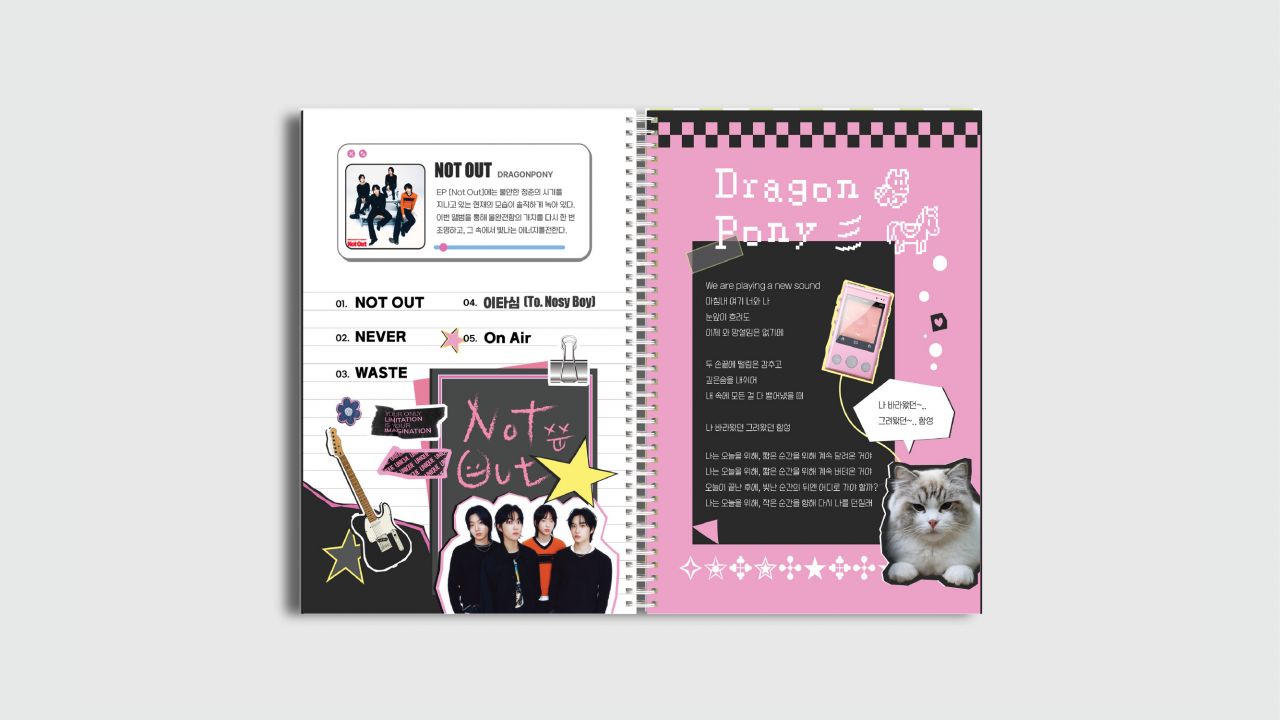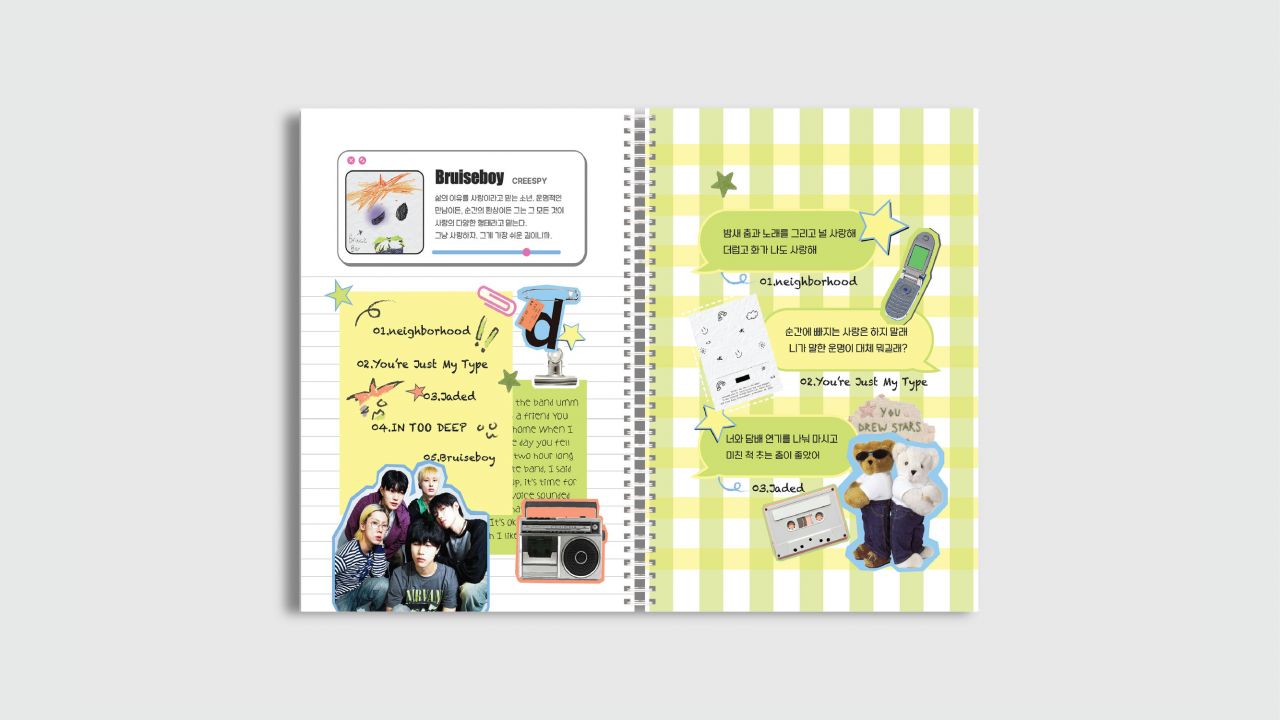 뿐만 아니라 좋아하는 곡의 가사와 의미, 멤버 구성원 등의 다양한 내용을 수록하여 시각적 즐거움과 개인적인 추억을 동시에 담아 소장가치 있는 기록물을 완성하였다.
