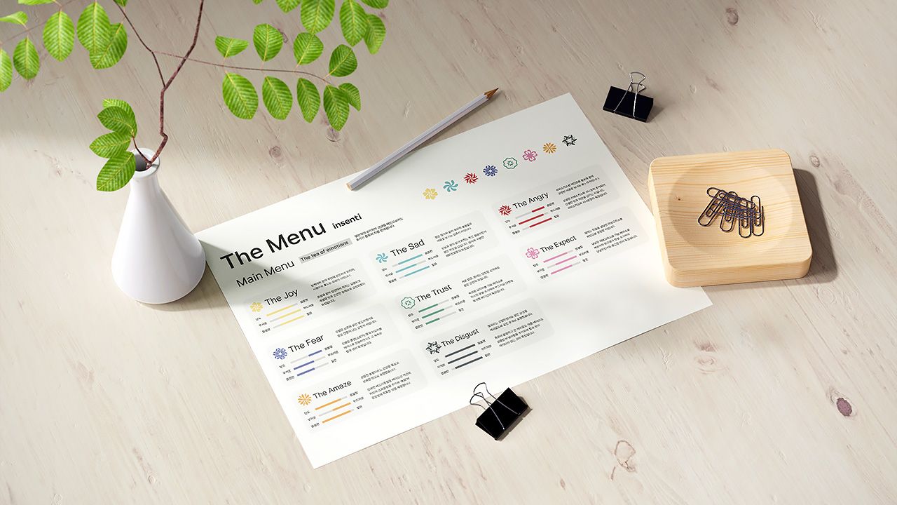 반복되는 현대사회 속에서 잊혀져 가는 나의 감정을 찾아가는 차(茶) 브랜드이다. 사람들의 감정을 차라는 형태로 우려내며, 각 감정마다 고유한 문양을 통해 후각·미각·시각으로 표현한다. 다양한 차를 자유롭게 블렌딩하며, 나만의 감정을 탐색하고 이해해 나간다.