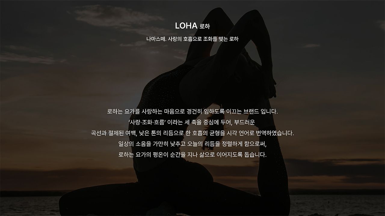 로하는 요가를 사랑하는 마음으로 경건히 임하도록 이끄는 브랜드이다. "사랑·조화·흐름" 이라는 세 축을 중심에 두어, 부드러운 곡선과 절제된 여백, 낮은 톤의 리듬으로 한 호흡의 균형을 시각 언어로 번역하였다. 일상의 소음을 가만히 낮추고 오늘의 리듬을 정렬하게 함으로써, 로하는 요가의 평온이 순간을 지나 삶으로 이어지도록 돕는다.