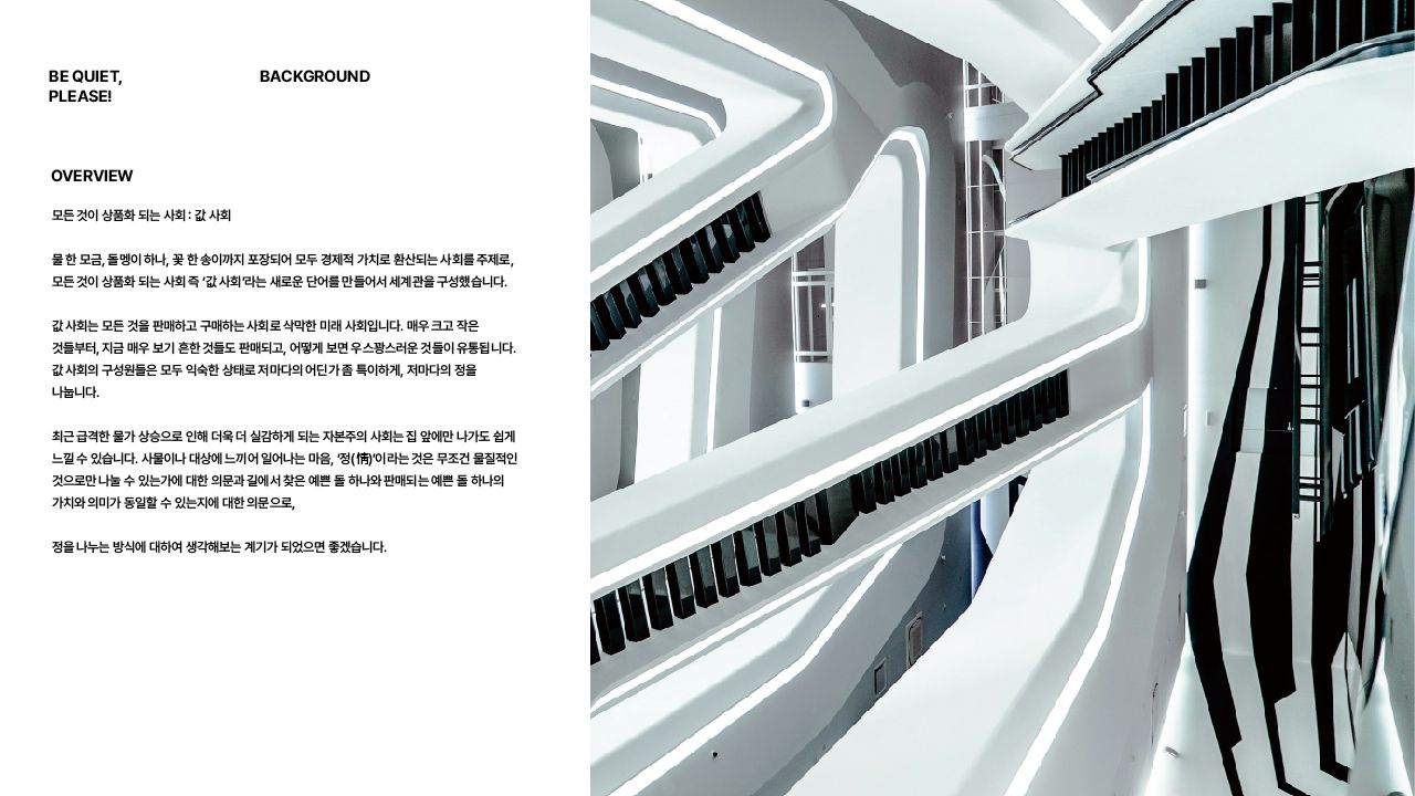 물 한 모금, 돌멩이 하나, 꽃 한 송이까지 포장되어 모두 경제적 가치로 환산되는 사회를 주제로 모든 것이 상품화 되는 사회, ‘값 사회’라는 미래 사회의 가상 드럭스토어를 오픈하는 프로젝트를 진행했다. 매우 크고 작은 것들부터, 지금 매우 보기 흔한 것들도 판매되고, 어떻게 보면 우스꽝스러운 것들이 유통된다. 값 사회의 구성원들은 모두 익숙한 상태로 저마다의 어딘가 좀 특이하게, 저마다의 정을 나눈다.