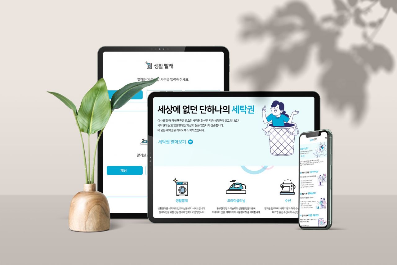 모두를 위한 세탁 배달 어플빨래할 시간이 없는 직장인, 대학생들을 위한 세탁 배달 어플로, 세탁과 어울리는 푸른색 계통의 색상을 하였으며, 일러스트 위주로 구성하여 생기 넘치는 느낌을 주었다. 웹페이지는 소개 위주로 페이지를 구성하였고, 모바일과 태블릿은 신청까지 가능하게 제작하였다.
