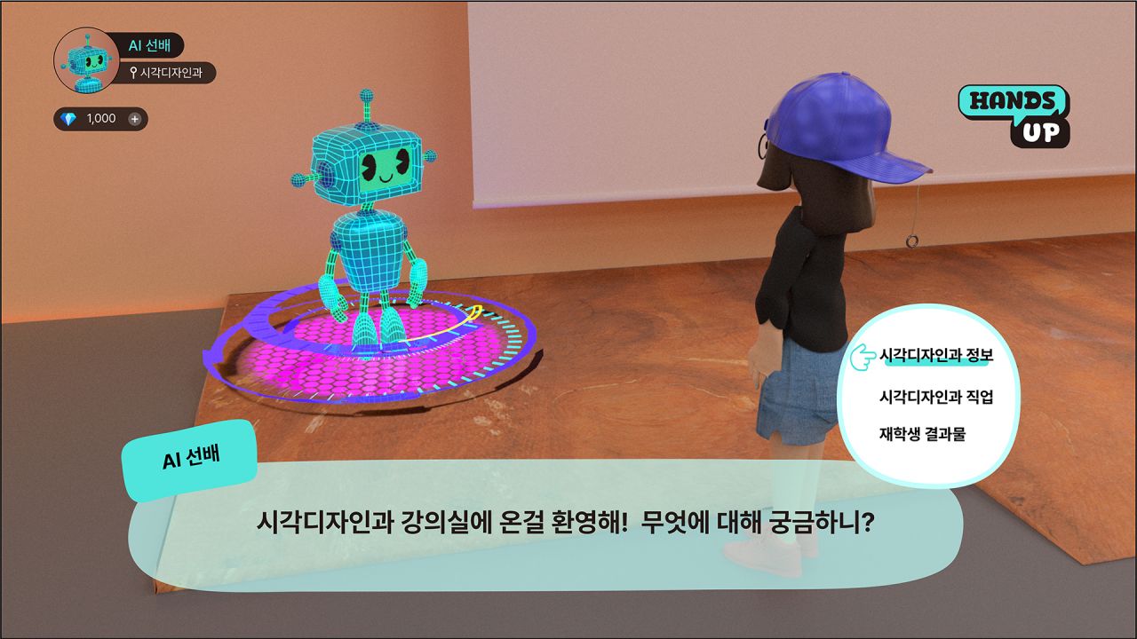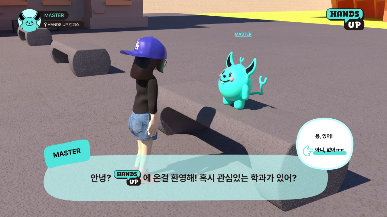 청소년을 위한 학과 체험 메타버스 플랫폼청소년을 위한 학과체험 메타버스 플랫폼 HANDS UP은 손을 들고 질문을 하는 학생들을 떠올리며 제작한 브랜드 네이밍이다. 다양한 학과 체험과 입시 정보를 제공하는 메타버스 기반의 커뮤니티이며, 청소년들이 자유롭게 학습하고 미래를 탐구할 수 있는 열린 교육 공간이다. 간단하고 친숙한 그래픽과 상호작용 요소를 통해 쉽고 재미있는 학과 체험을 목표로 디자인하였다.
