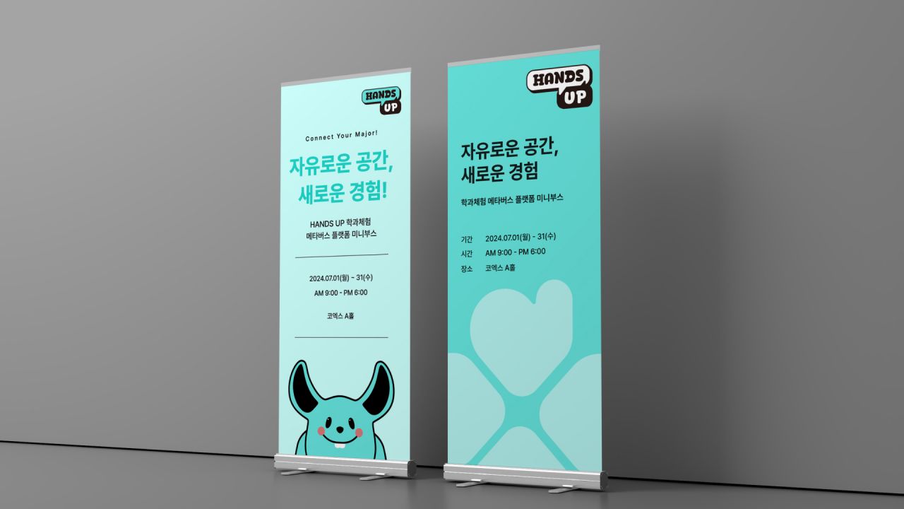 청소년을 위한 학과체험 메타버스 플랫폼 HANDS UP은 손을 들고 질문을 하는 학생들을 떠올리며 제작한 브랜드 네이밍이다. 다양한 학과 체험과 입시 정보를 제공하는 메타버스 기반의 커뮤니티이며, 청소년들이 자유롭게 학습하고 미래를 탐구할 수 있는 열린 교육 공간이다. 간단하고 친숙한 그래픽과 상호작용 요소를 통해 쉽고 재미있는 학과 체험을 목표로 디자인하였다.