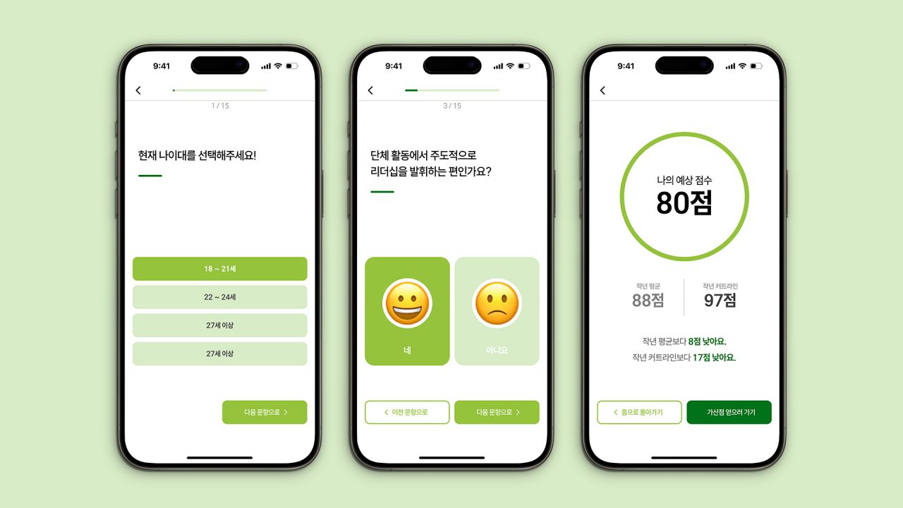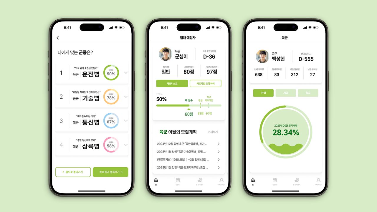 군 입대 예정자, 군인들을 위한 고민 해결 모바일 플랫폼 서비스군심은 군 입대를 앞둔 청년들, 그리고 현역 군인들의 고민 해결을 위한 모바일 플랫폼 서비스이다. 입대 예정자에게는 군종별 정보, 병과 추천, 경쟁률 등 필수적인 정보를 제공하며, 체계적인 체크리스트로 준비 과정을 돕는다. 또한, 현역 군인들에게는 남은 복무 일정과 휴가 관리 기능을 통해 계획적인 복무 생활을 지원하고, 복무 중에도 가족, 연인과의 소통을 돕는 기념일 알림과 일정 공유 기능을 통해 관계를 유지할 수 있도록 설계되었다.