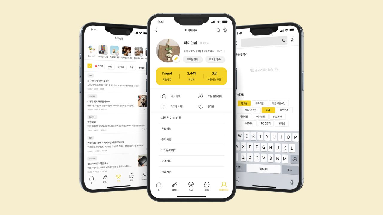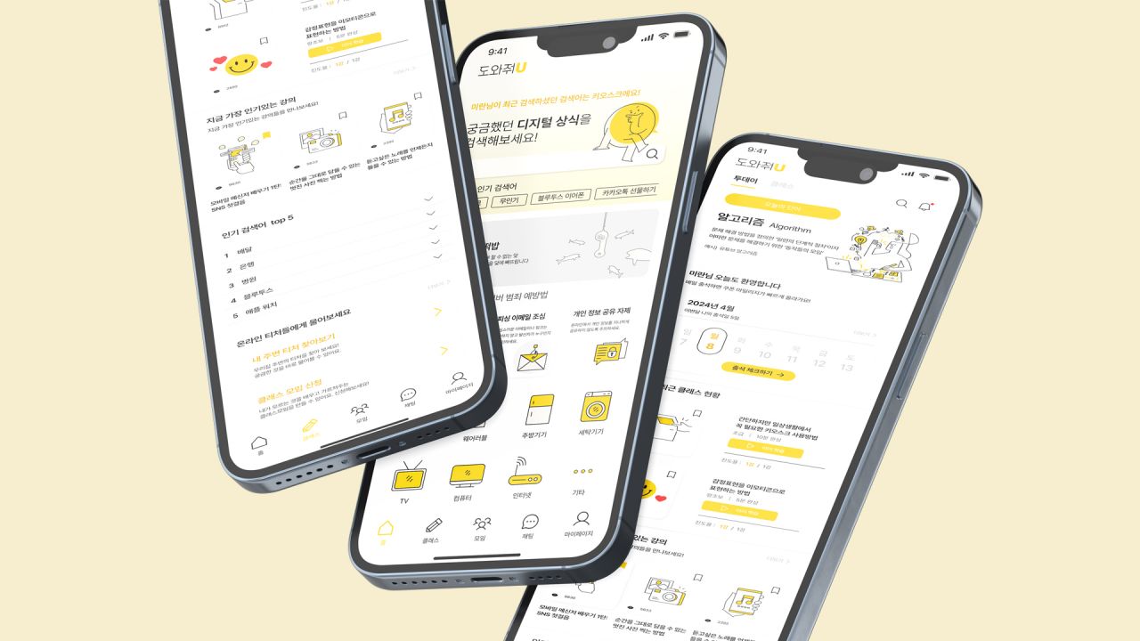 코로나19 이후 비대면 서비스의 증가로 이에 적응하기 어려운 시니어 세대들을 위한 앱으로, 따뜻한 색감의 노란색을 포인트 컬러로 사용하였다. 디지털 기기를 알려주는 기능을 추가했으며, 이를 시니어 세대가 이해하기 쉽도록 쉬운 단어와 단계별 학습 시스템을 제공하였다. 그뿐만 아니라 동네 모임 및 소통 기능을 추가하여 시니어 세대의 소극적인 생활 활동을 늘리는 기대효과를 노리고 있다.