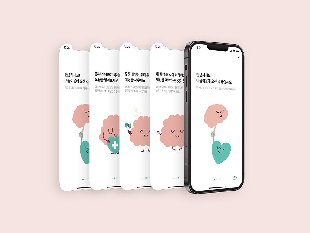 마음이음은 정신건강 증진을 목표로 한 애플리케이션이다. 사용자들에게 쉼터, 상담, 커뮤니티, 그리고 맞춤형 자기관리 기능을 제공한다. 다양한 상담 옵션과 공감 기반 소통을 제공하여 정서적 회복을 돕는다. 안전한 공간에서 비슷한 사람들과 함께 경험을 나누고 서로 지지할 수 있는 커뮤니티를 운영하며 이를 통해 지속적인 마음 챙김과 긍정적인 변화에 기여하는 것을 목표로 제작하였다.