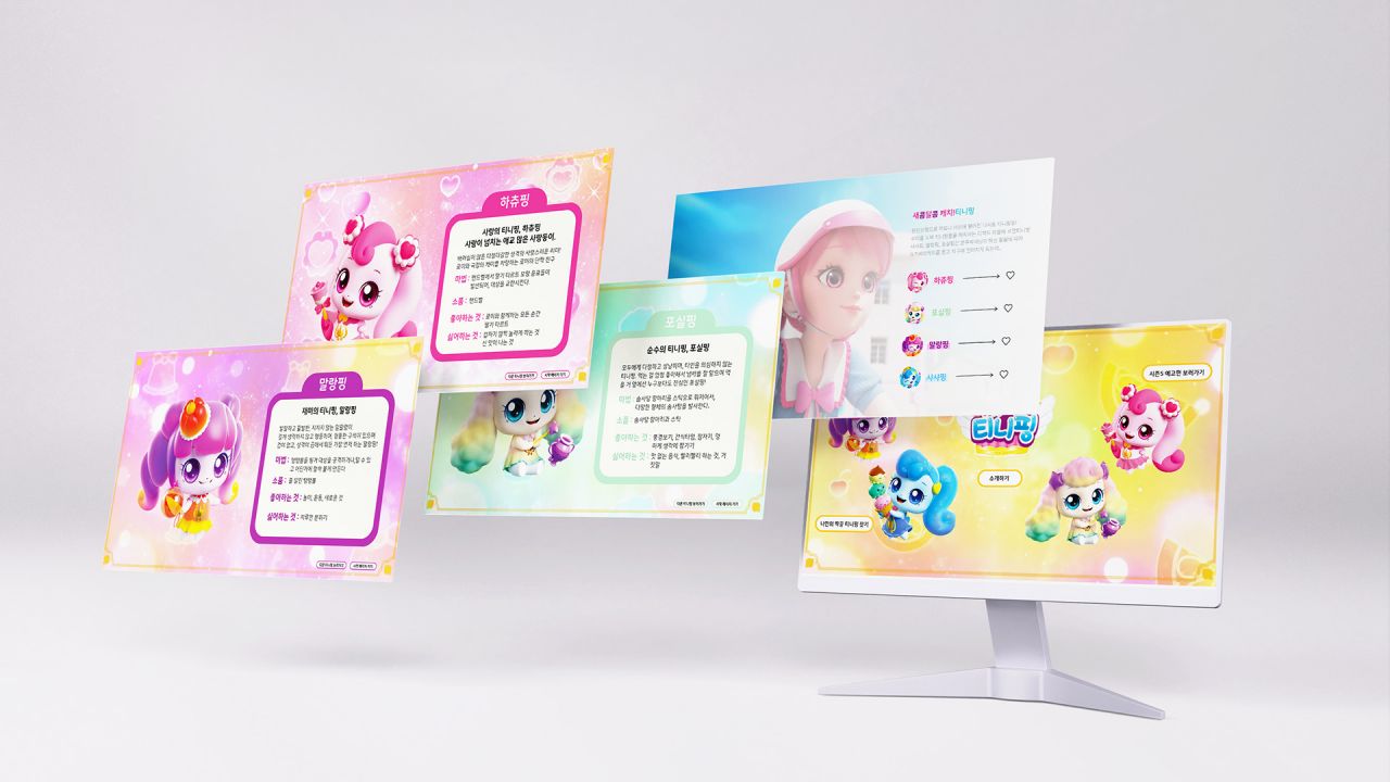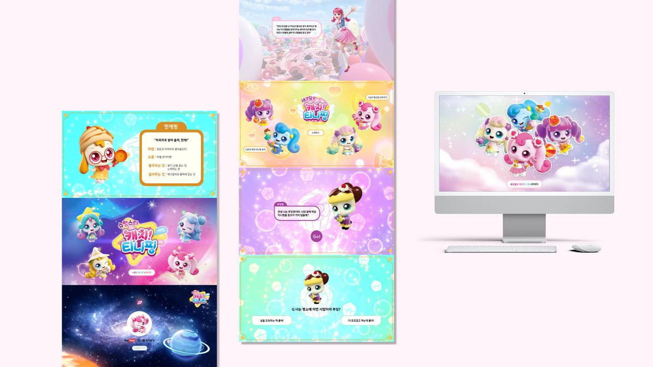 새콤달콤 캐치 티니핑을 소개로 유튜브 티니핑TV 구독을 유도하는 마이크로 사이트이다. 캐릭터 소개와 함께 다음 시즌 예고편을 제공하여 사용자들에게 흥미를 유발하도록 고민하였다. 궁극적으로는 본 마이크로 사이트 서비스를 통해 유튜브 티니핑TV 구독을 유도하였다.