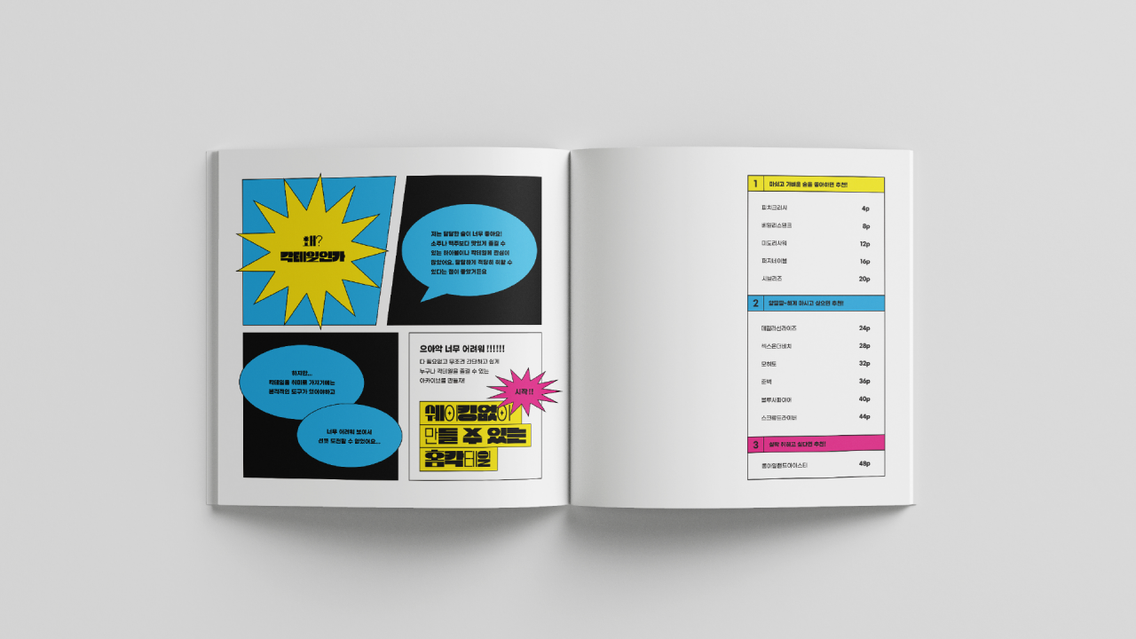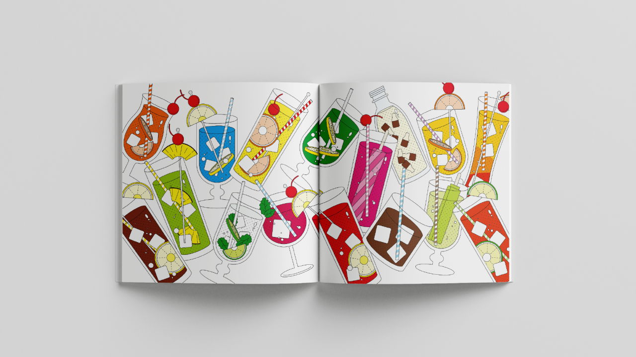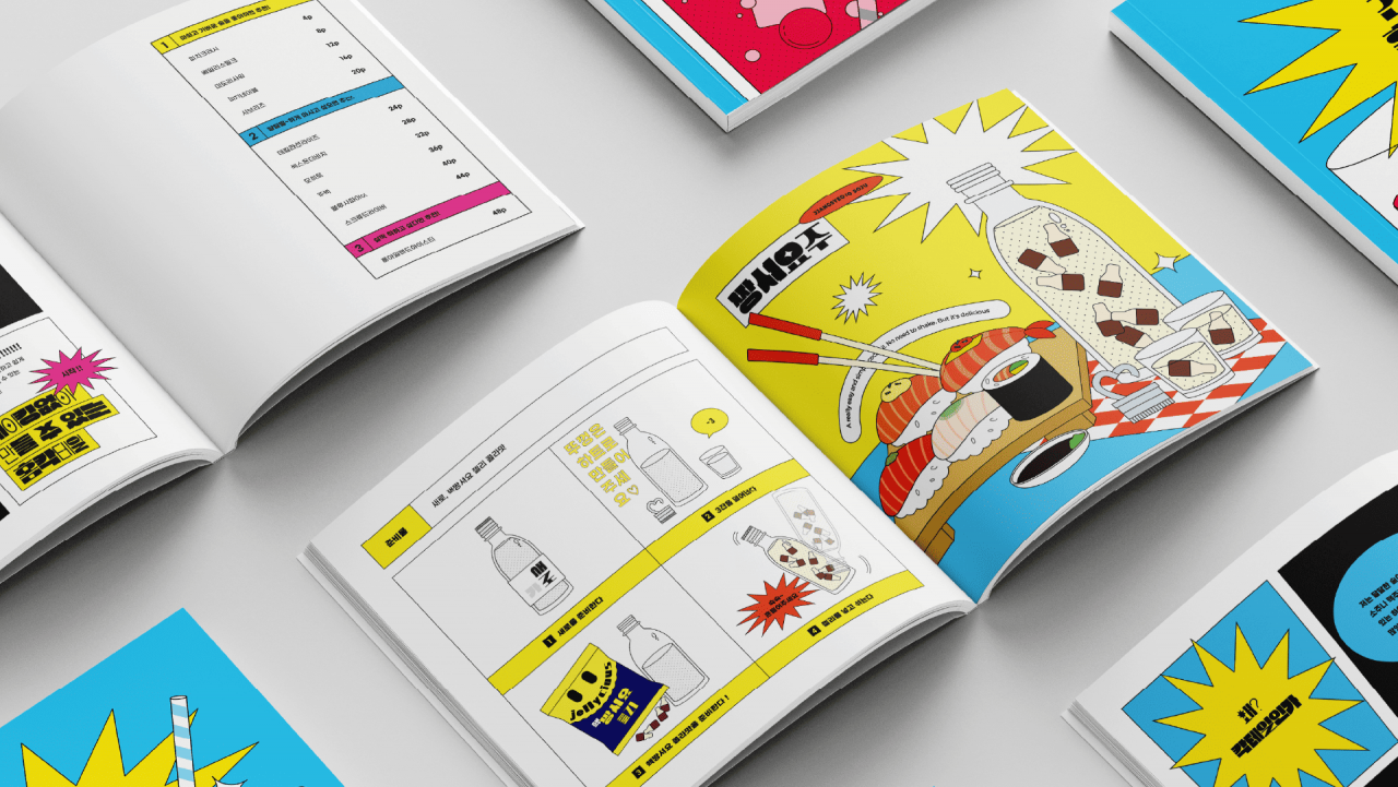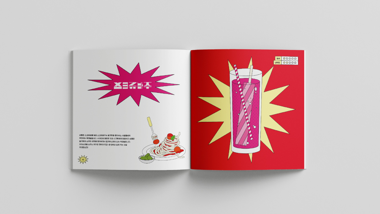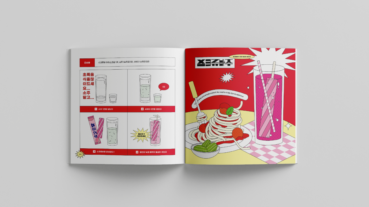 칵테일의 제조 방법과 완성된 칵테일을 직관적인 디자인으로 표현하여 누구나 쉽게 따라 할 수 있도록 하였고, 칵테일과 어울리는 비비드한 색감으로 칵테일의 맛을 시각화하고자 하였다.