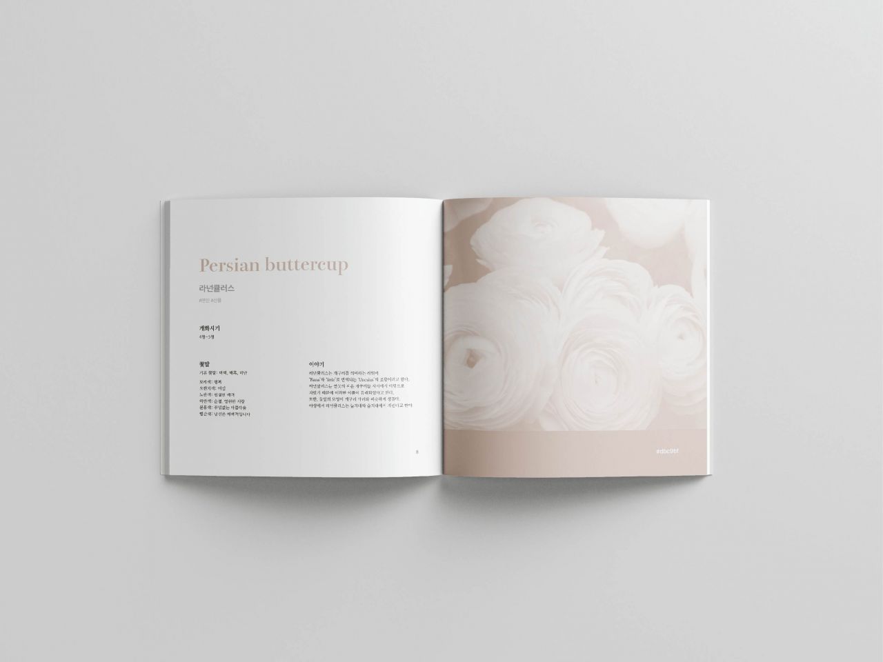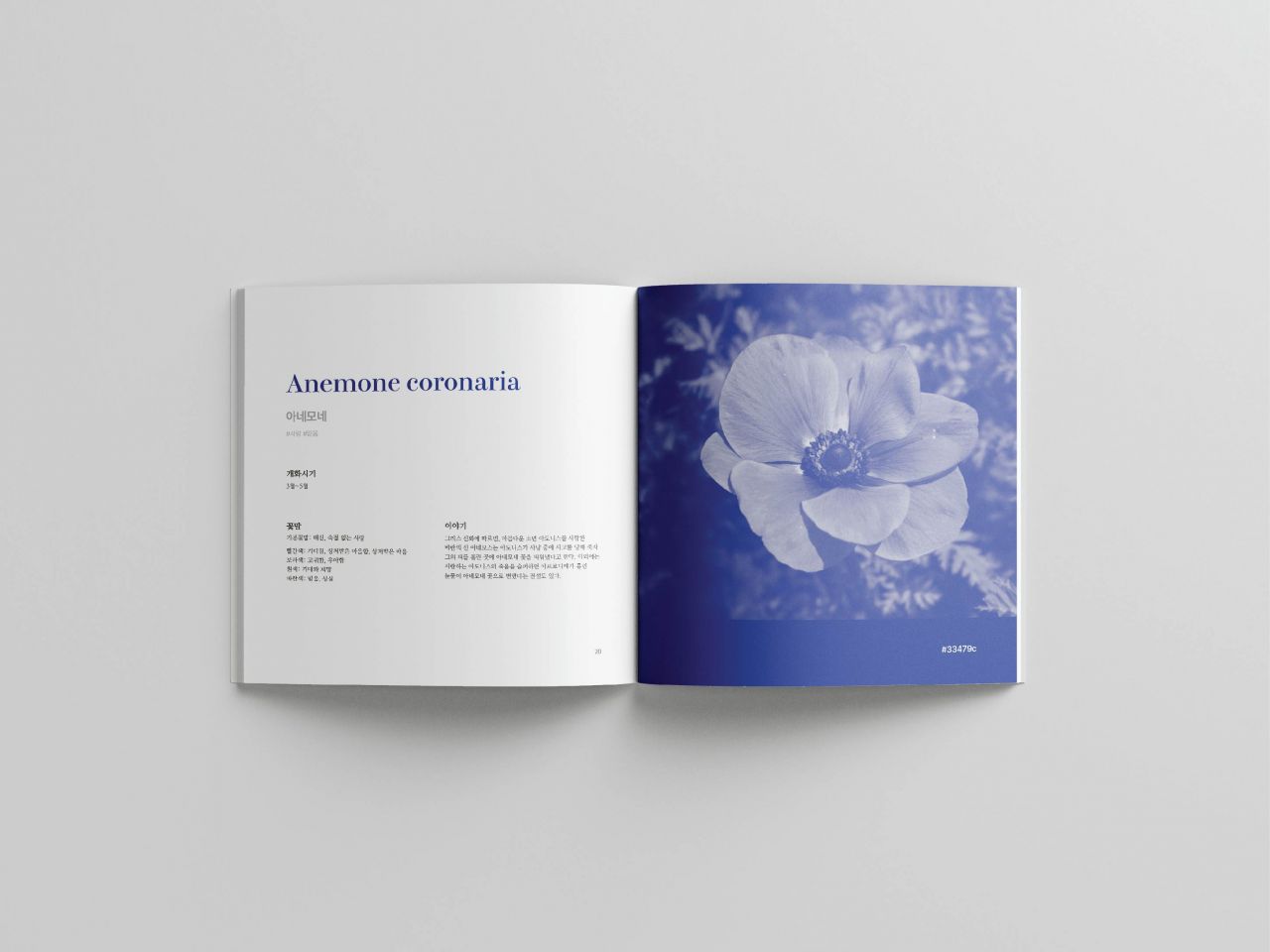 꽃을 사랑하는 사람들과 성공적인 꽃 선물을 하고 싶어 하는 사람들을 위해 제작된 꽃 아카이빙 북이다. 꽃과 어울리는 해시태그로 꽃 선물을 고민하고 있는 사람들에게 유용한 정보를 제공하고, 꽃말과 개화 시기, 꽃을 둘러싼 이야기를 담고 있다. 각 꽃이 가진 고유한 색에서 추출한 색상을 활용해 이미지를 제작하고, 색상을 코드화 하여 기재한 것이 특징이다.