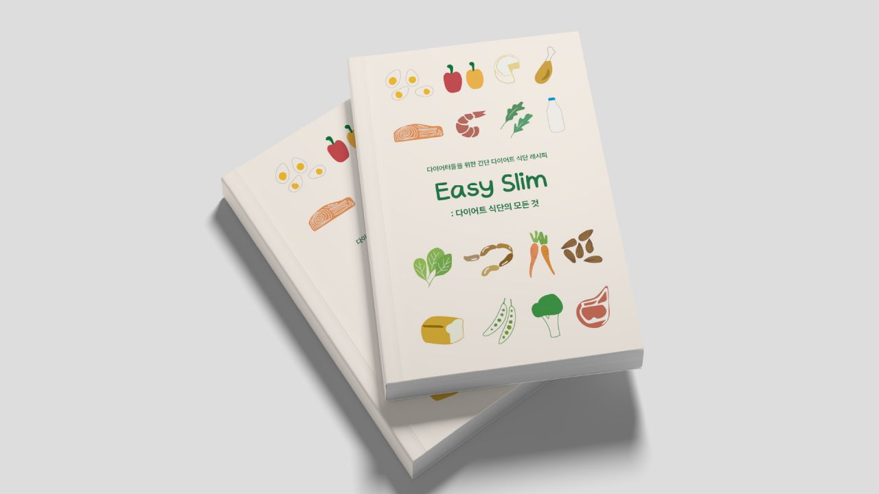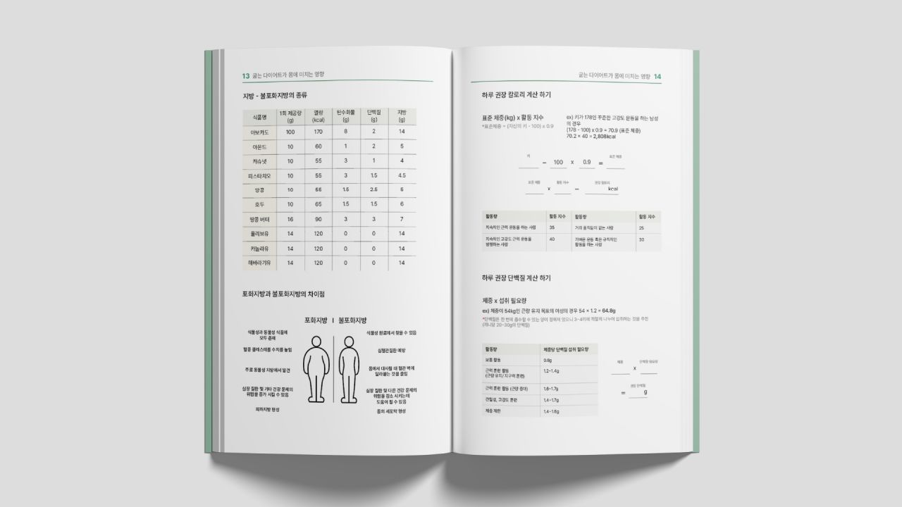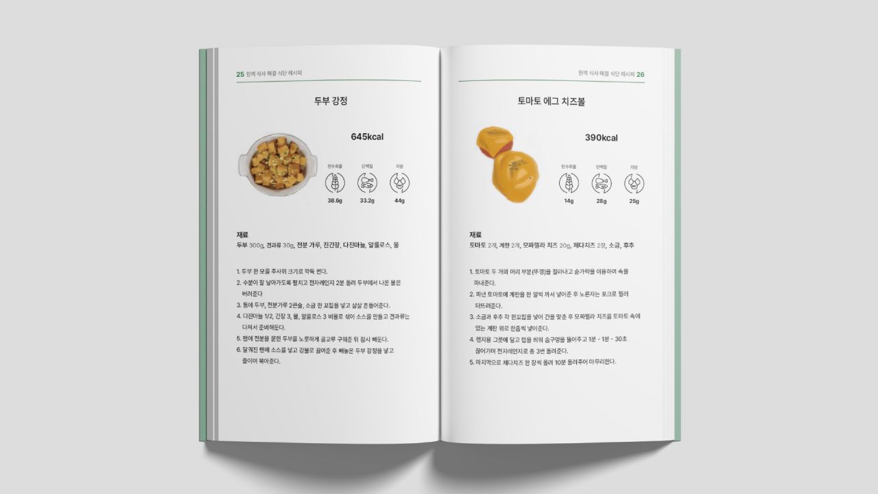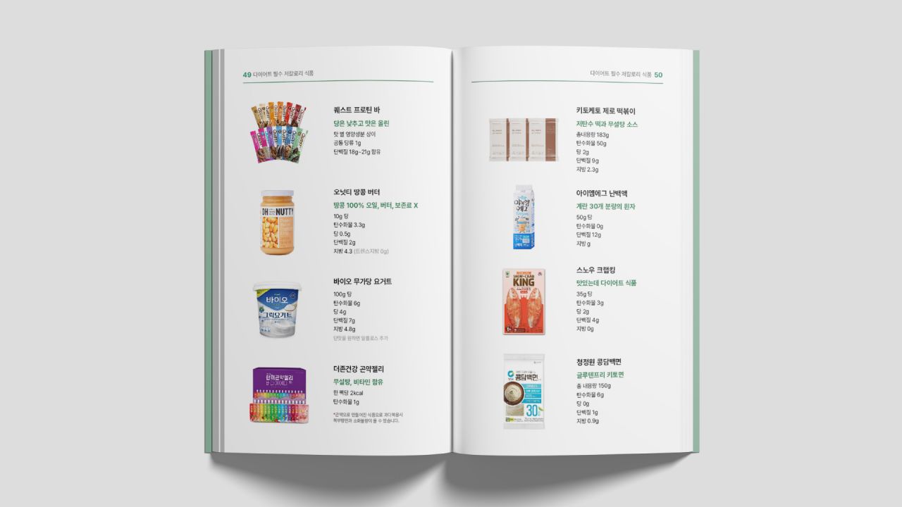 다이어트 열풍으로 인해 잘못된 지식으로 굶는 다이어트, 영양소가 맞지 않는 식단을 하는 사람들이 늘어났다. 이를 바로잡기 위해 내게 맞는 권장 섭취량과 영양 밸런스를 맞춘 레시피, 시중에 판매되는 저칼로리 제품들을 담은 아카이브 북을 제작하였다. 비슷한 재료로도 여러 음식을 만들 수 있게끔 안내하고 있으며, 일러스트를 활용하여 친근함을 전달하고자 하였다. 초록 계열의 컬러는 건강한 다이어트를 연상케 한다.