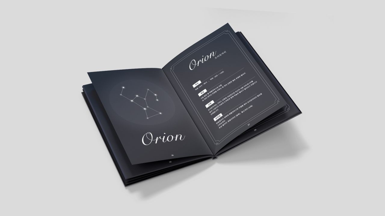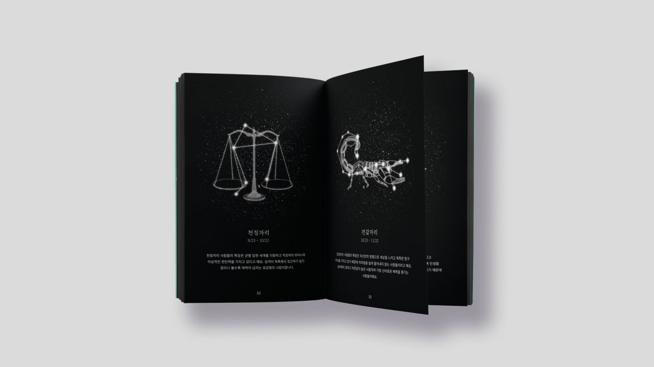 각 계절의 별자리를 소개하며 생일에 따른 별자리별 성격과 특성을 탐구하는 아카이브 북으로, 자신의 별자리와 계절의 상관관계를 발견하며 별자리가 주는 위로와 영감을 느낄 수 있도록 구성하였다. 별자리의 신화적 이야기와 현대적 해석을 함께 담아 흥미를 더하였으며, 계절마다 달라지는 밤하늘의 아름다움을 기록함으로써 별을 통해 자신과 세상을 연결해 보길 바라는 마음을 담았다.