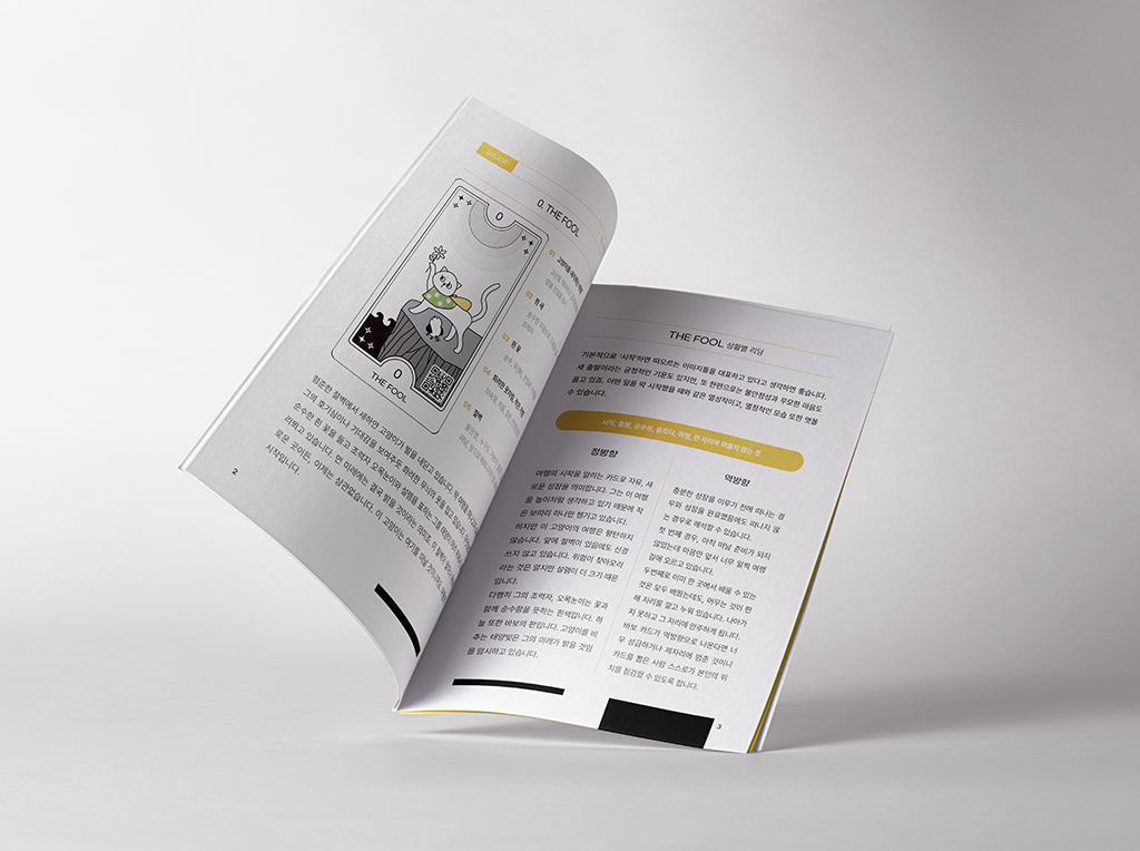 초보자를 위한 타로카드입니다. 타로는 카드의 뜻을 모를 경우 외울 때까지 끊임없이 책을 펼쳐 해석을 확인해야 하지만, 해설지를 항상 가지고 다니는 것은 쉽지 않습니다. 또한 책을 넘겨가며 해석을 찾아야 한다는 불편함도 있고요. 이 타로는 초보자를 위한 웨이트 기반의 타로이며 카드에 QR 코드를 삽입하여 해설지를 가지고 다니지 않아도 괜찮습니다.